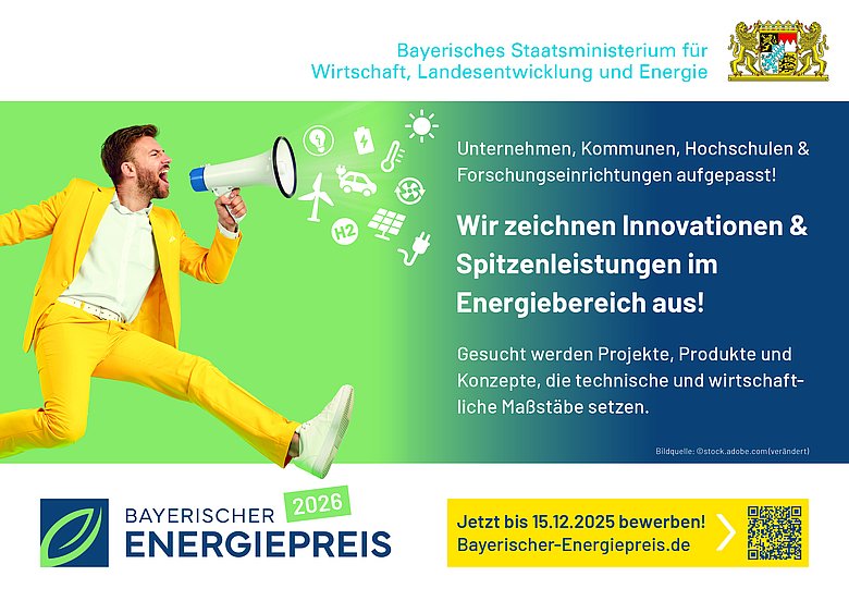 Seit 1999 vergibt das Bayerische Wirtschaftsministerium den Bayerischen Energiepreis. Die renommierte Auszeichnung steht für einen innovativen und verantwortungsvollen Umgang mit Energie. Nun startet die Bewerbungsphase für die nächste Runde 2026. Wir freuen uns, dass die Bayerischen Energieagenturen als Partner des Wettbewerbs mitwirken und die Sichtbarkeit zukunftsweisender Projekte in ganz Bayern stärken.