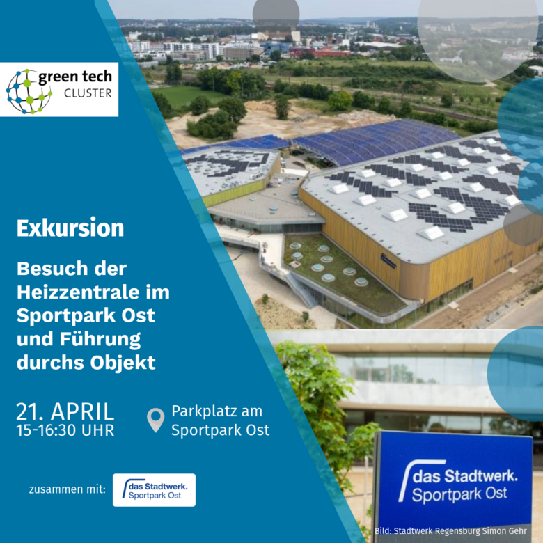 Der Green Tech Cluster Regensburg lädt zu einer Exkursion in den Sportpark Ost ein. Vor Ort wird die innovative Heizzentrale besichtigt, die den Sportpark vollständig CO₂-neutral mit Wärme versorgt. Die Anlage kombiniert ein großflächiges Solarthermie-Kollektorfeld mit einem Hackschnitzelkessel und Wärmespeicher.